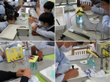 3年2組の理科の授業では、塩化銅に電流を流し、銅と塩素を発生させる実験をしました。続いて、イオン化傾向を見るためアルミニウムやマグネシウムを入れて、結果を確認しました。