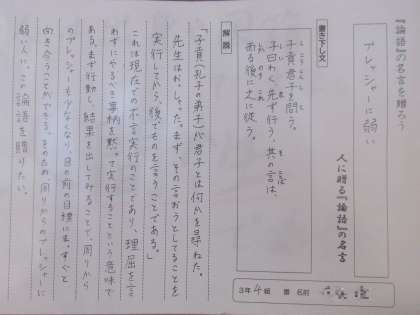 3年生の国語の単元「論語」について、各自で選んだ名言を
