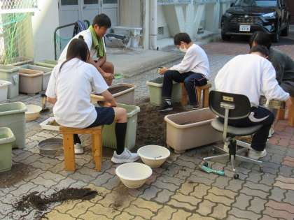 1組の生活科の授業では、冬野菜の栽培準備として、土ふるいをしました。