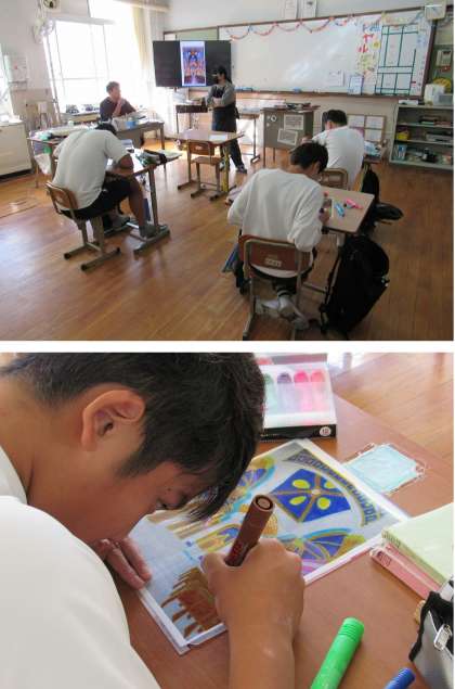 1組の美術科の授業は、年明けに実施される「小さな巨匠展」への出品を目指して、前回に続いてシャガールの関係するユダヤ協会「シナゴーグ」のステンドグラスの制作をしました。