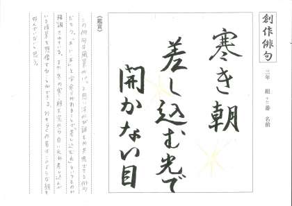 3年生の国語の単元で「有季定型」で創作したみなさんの俳句を廊下に掲示していますので、代表的な作品をこのHP上でも少しずつ紹介しています。
