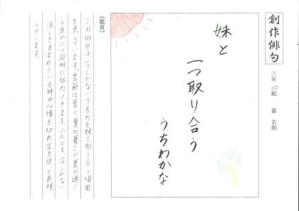 3年生の国語の単元で「有季定型」で創作したみなさんの俳句を廊下に掲示していますので、代表的な作品をこのHP上でも少しずつ紹介しています。