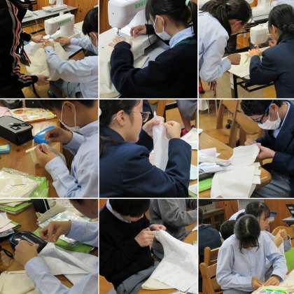 1年2組の家庭科の授業では、エコバックの口部分をミシンで縫いました。早く終わった人は、“刺し子ふきん”に制作に取り掛かりました。