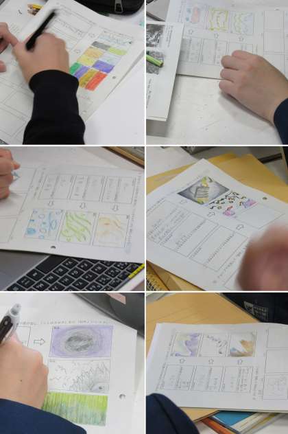 3年2組の美術の授業では、ある作曲家の音楽から得た発想に基づいて抽象画制作に取り掛かりました。