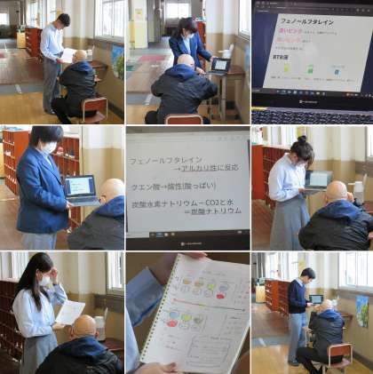 3年2組の理科の授業では、酸・アルカリの実験についてまとめ、一人ずつ発表しました。