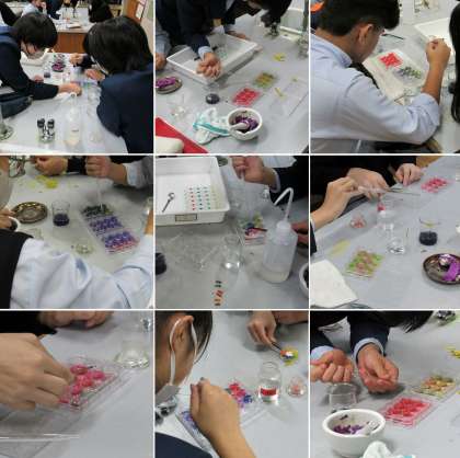 3年2組の理科の授業では、酸・アルカリの中和実験を行いました。紫キャベツを絞って指示薬にしました。