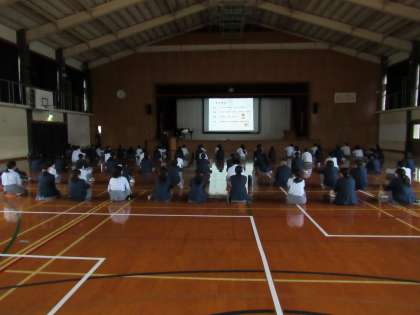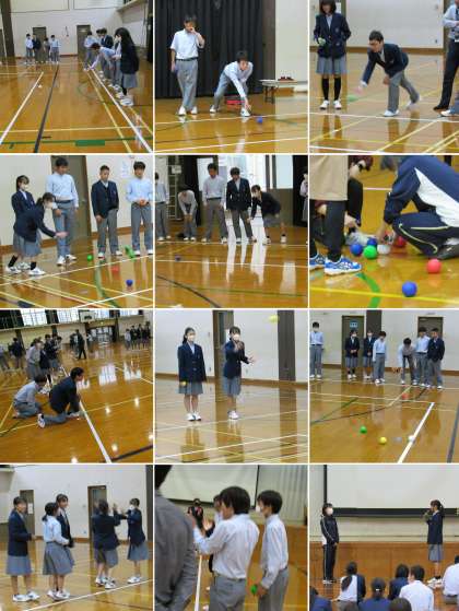 本日(10日)5・6時間目の2年生人権学習で、京都市障害者スポーツセンターから先生をお招きして、障害者への理解を深めるための人権学習を行いました。講話に続いて、より多くの人が同時に楽しめるようにアレンジした新しい競技「スクエアボッチャ」について実技指導を受け、実際に体験しました。