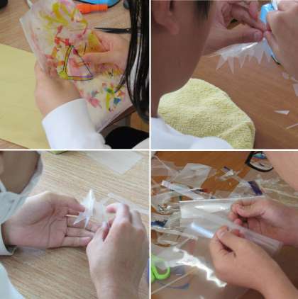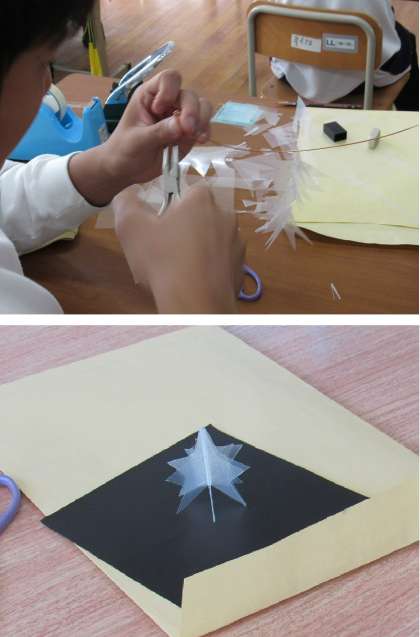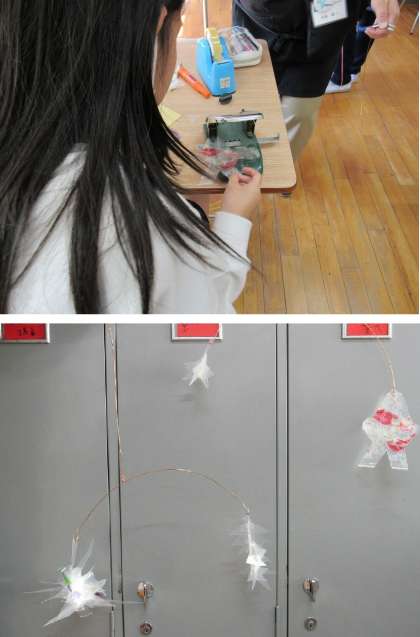 1組の美術科の授業は、クリスマスのイベントに向けた飾り付けとして、クリアファイルを切り抜いて、星の形を作り、モビールを作りました。