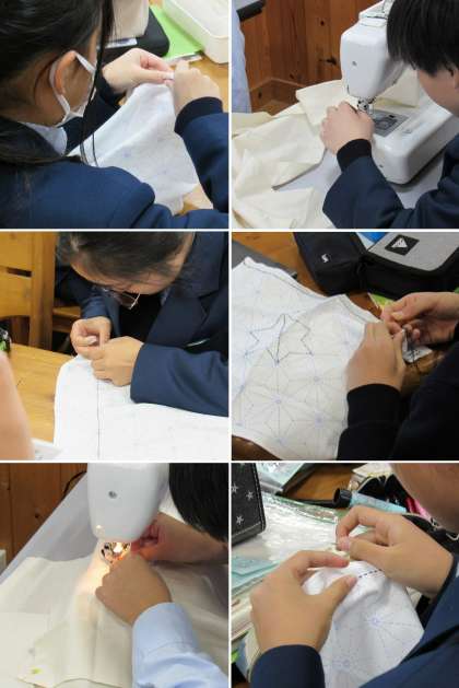 1年2組の家庭科の授業では、エコバック作りでポケットの部品を本体に縫い付けました。早く終わった人は、“刺し子ふきん”の制作をしました。