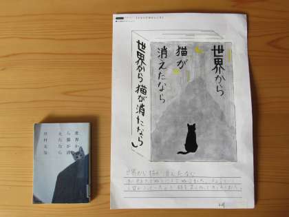 今回は、1年2組のKさんがデザインした【世界から猫が消えたなら】の表紙です。