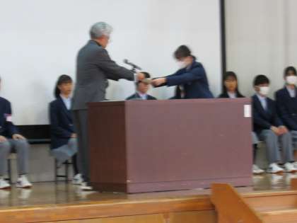 そして、最後に新役員から旧役員に対しこれまでの生徒会活動に対して感謝の意をこめて、感謝状が贈られました。