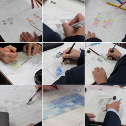 1年3組の美術科の授業では、前回に続き、色面分割の制作をしました。