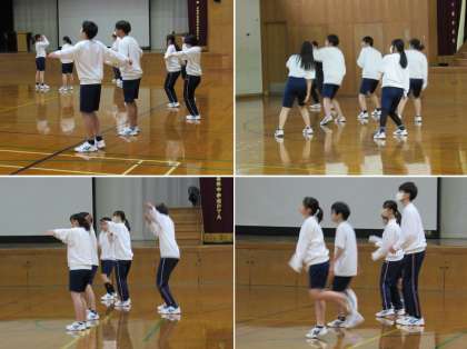 3年3組の保健体育科の授業では、ダンスの基本ステップの練習と学期末にクラスごとで発表するダンスの練習をしました。生徒に馴染みのある今はやりの楽曲を使った現代的なリズムのダンスで、楽曲は各クラス共通のものを使いますが、クラスごとに異なった振付けをしてクラスの特色を出すようです。