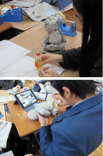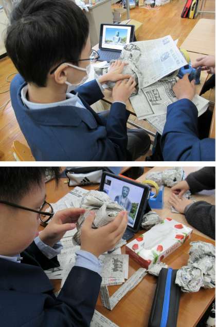 1組の社会科の授業では、鎌倉時代の文化に触れるべく、鎌倉大仏を新聞紙で作ってみました。