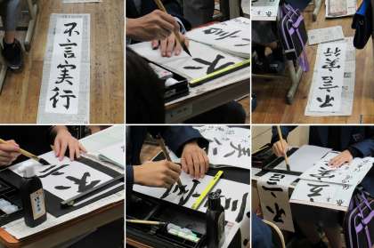 1年3組の国語科の授業では、「不言実行」という四字熟語を行書で書初め用紙に書写しました。