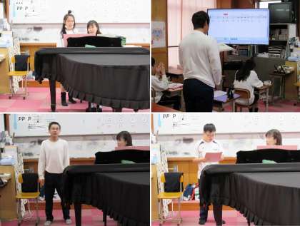 1組の音楽科の授業では、みんなで出し合ったリズム問題の解答を確認し合い、また、「エーデルワイス」を一人ずつ歌って聴かせたり、「となりのトトロ」をジャズアレンジで歌ったりしました。するとリズムに乗ってH先生とSさんが踊り始めました。