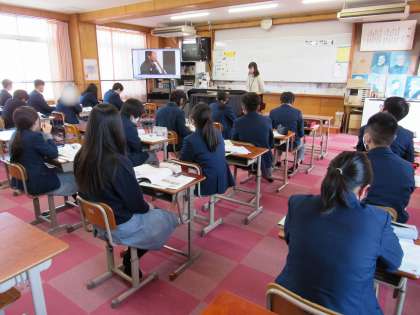 3年2組の音楽科の授業では、「尺八」について、その奏法などを学んだ後で、尺八楽「巣鶴鈴慕」を鑑賞しました。