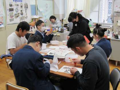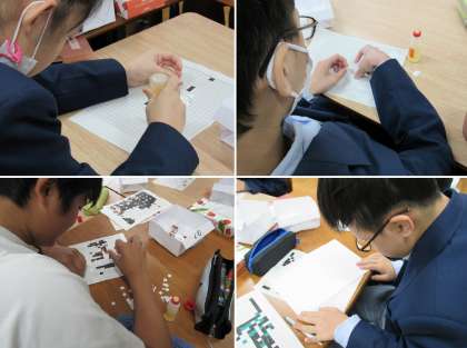 1組の美術科の授業では、来年2月(前回記載した“1月”は誤りでした)に開催される「小さな巨匠展」への出品共同制作のためのモザイクアート制作を引き続き行いました。
