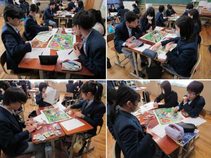 3年3組の英語科の授業では、日常使われる英単語の習得も兼ねて、英語版の人生ゲームをしました。