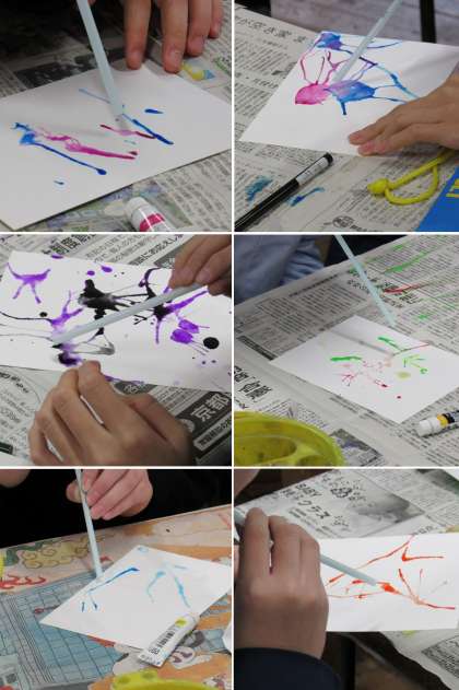 1年2組の美術科の授業では、「フロッタージュ」「吹き流し」「たらし込み」などのモダンテクニックを使って、以後制作する作品の材料作りをしました。
