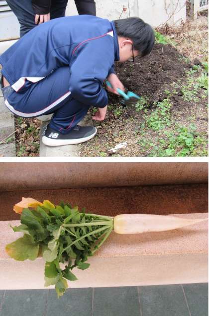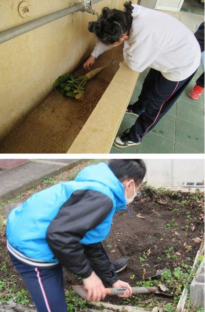 1組の生活科の授業では、ダイコンの収穫と次に栽培するジャガイモのための準備をしました。