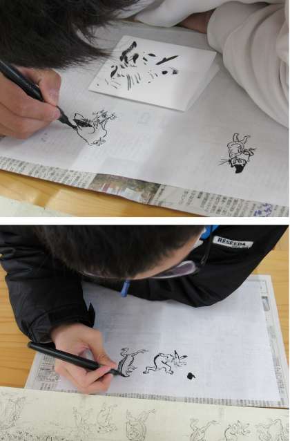 1組の美術科の授業では、前回に続いて「鳥獣人物戯画」の模写を行いました。