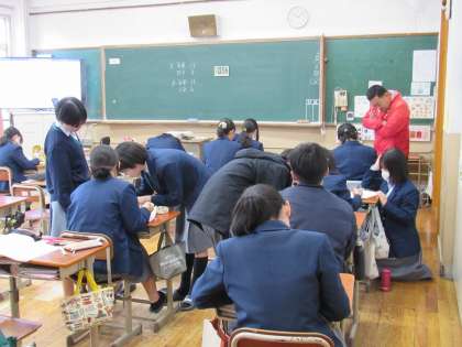 2年4組の音楽科の授業では、文楽「野崎村の段」の鑑賞後、「3年生を送る会」の合唱曲「時を越えて」の合唱練習をしました。
