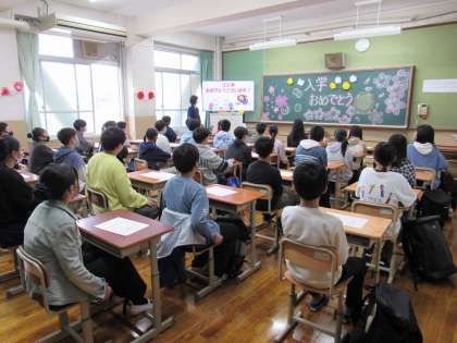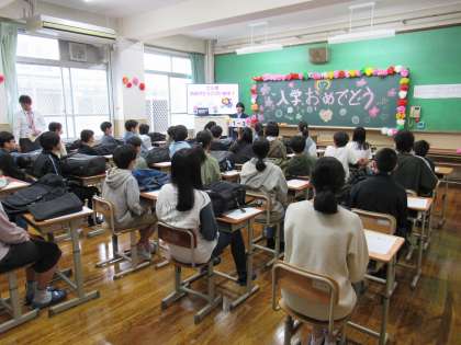 まず、発表された教室で、出欠確認の後、生徒会役員のみなさんからの歓迎の挨拶に続いて入学式の要領をパワーポイントを使って説明を受けました。