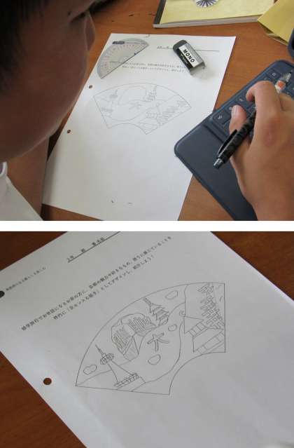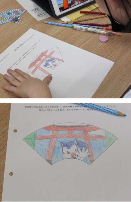 1組の美術科の授業では、二人の3年生が在籍していることから、2年生も一緒に修学旅行先の民宿への贈り物とする扇子型しおりのデザインを考えました。