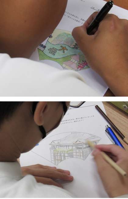 1組の美術科の授業では、二人の3年生が在籍していることから 2年生も一緒に、修学旅行先の民宿への贈り物とする扇子型しおりの制作に取り掛かりました。