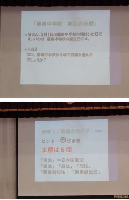 このゴールデンウィーク中の祝日や「嘉楽中学校」にまつわる事柄をクイズ形式で説明がなされました。