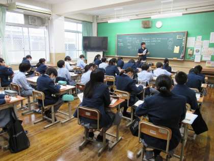 1年2組の家庭科の授業では、衣生活の単元で、和服が平面的に対し、洋服が立体的であることなど、両者の違いについて学びました。