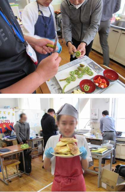 1組の英語科の授業では、3回にわたる「世界の朝食」というテーマの授業の最終段階として、プレゼンにより1年生が勝ち取ったカナダの朝食(パンケーキ、ベーコン目玉焼き、フルーツ)を料理しました。そして、授業参観に見えられた保護者の方が見守る中、キウイフルーツの皮むきに手こずっていると、見かねた保護者の方が見事な包丁さばきで、手本を見せてくれました。
