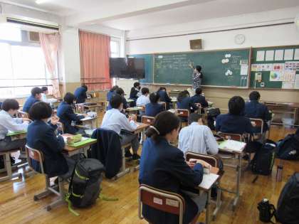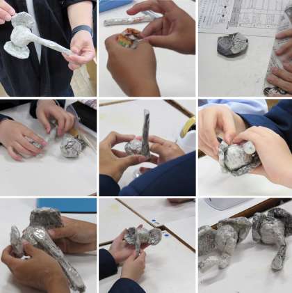 2年4組の美術科の授業では、「嘉楽中学校に生きるいきもの」の立体作品を制作するに当たり、新聞紙を使って、まず、みんな一斉に同じ手順で、象の頭部を試作品として作ってみました。