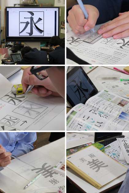 1年2組の美術科の授業では、レタリングをするに際し、まず、書道に必要とされる基本技法8種類が全て含まれている漢字『永』を明朝体で練習した後、授業で使用するファイルの表紙への教科「美術」と「自分の名前」を明朝体で、中央に「美」をゴシック体でレタリングし始めました。