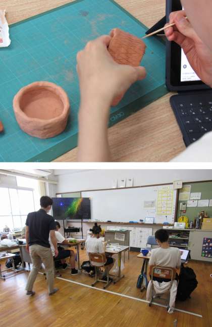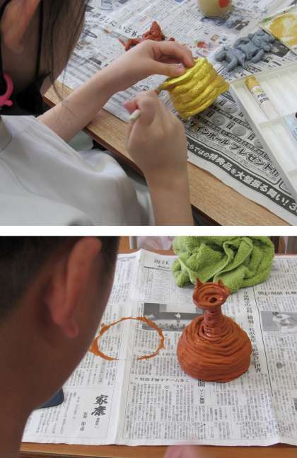 1組の社会科の授業では、古代人の生活を体験するために、粘土で埴輪や土器を作りました。