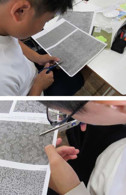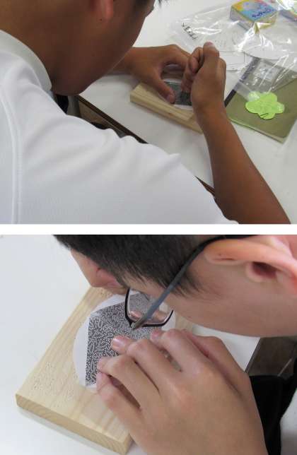1組の美術科の授業では、これまでのあかりの部品製作について、今回は、江戸小紋を使って、光を透す穴をあけた部品を作りました。