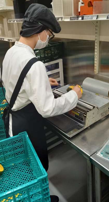 スーパーでは、生徒3人が、それぞれの仕事(野菜の包装、品出し、用具の掃除)をテキパキとこなしていました。