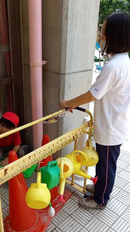 3人の生徒が、子どもを見守ったりお世話をしたりしていました。