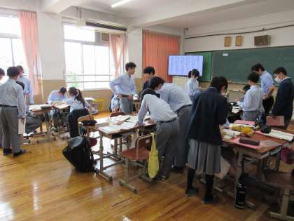 2年2組の国語科の授業では、「沼田英治著、説明的文章“クマゼミの増加の原因を探る”」について、「前提」が図付きである理由や図の読取り方など、提示された5つの謎を班で解き明かしました。