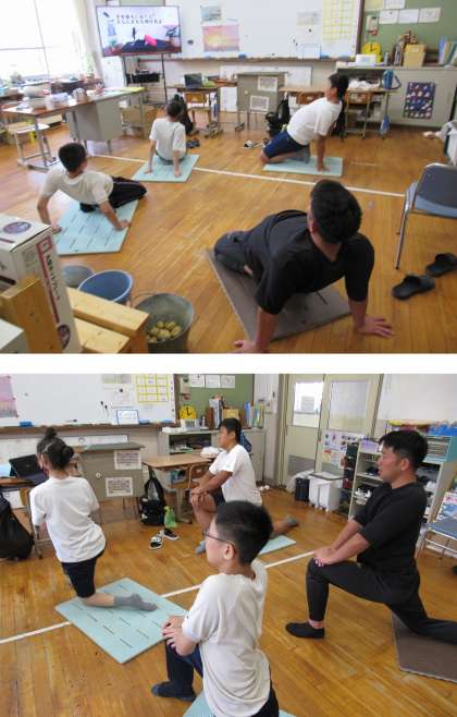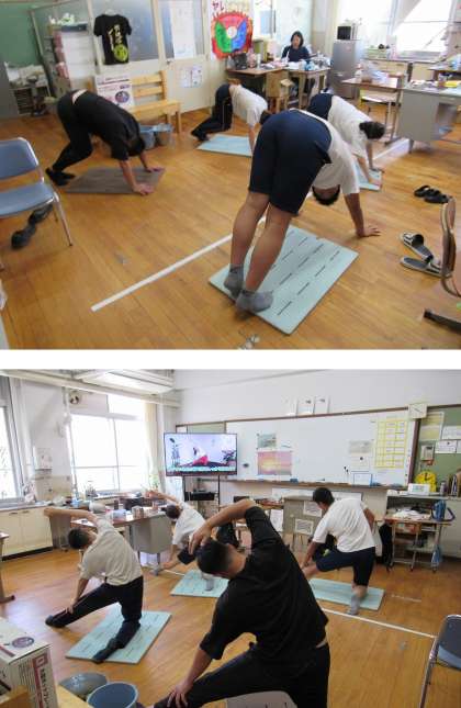 1組の生活科の授業では、ラジオ体操、ストレッチ、有酸素運動などにより、頭と体をすっきりさせて次の座学に臨むことができました。