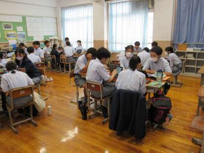 3年2組の英語科の授業では、現在完了についてグループ内でミニ授業をすることにより、定期テスト対策をしました。