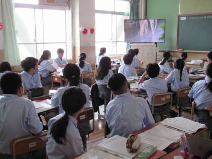 1年3組の英語科の授業では、ALTの先生から出身国ニュージーランドの学校について紹介を受け、質疑などをして会話練習をしました。