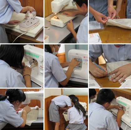 1年2組の家庭科の授業では、前回に続いて「作って楽しい布作品」というテーマで、「鞄」「巾着」「クッションカバー」「ティッシュケース」「ウォールポケット」「ランチオンマット」の6種類の内から一つを選び、制作しました。