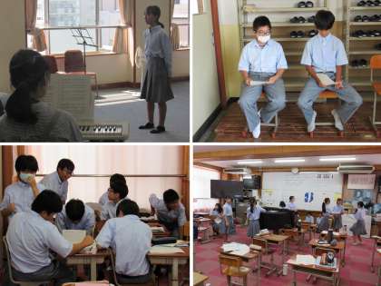 1年2組の音楽科の授業では、合唱コンクールの学年合唱曲「小さな勇気」の自分のパートの歌唱テストを受けました。待機している者やテストを終えた者は、合唱交歓会の曲「翼をください」のパート練習をしました。