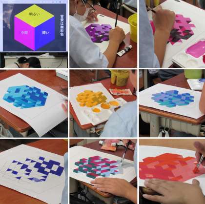 1年3組の美術科の授業では、色面分割を色のトーンで着彩しました。