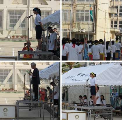 生徒会長の開会宣言に始まり、校歌斉唱・生徒会旗掲揚、学校長挨拶、生徒代表挨拶、選手宣誓、準備体操、諸注意とプログラムどおりに進行しました。