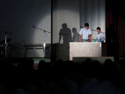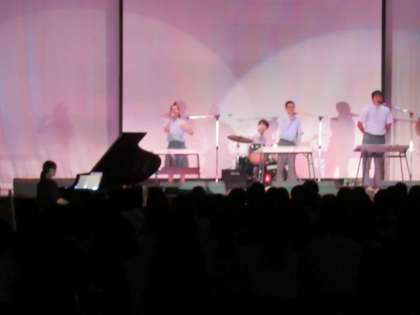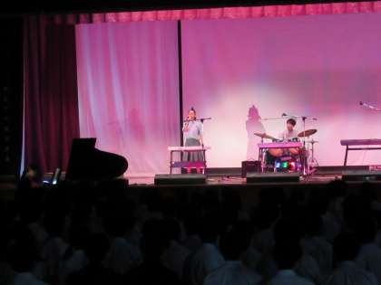 3年生NさんとYさんによる「カップス演奏」、2年生のTさんの独唱、そして最後に3人のキーボードと音楽科のS先生のピアノ、数学科のY先生のドラムスによる「銀河鉄道999」の合奏と重唱で会場は大いに盛り上がりました。