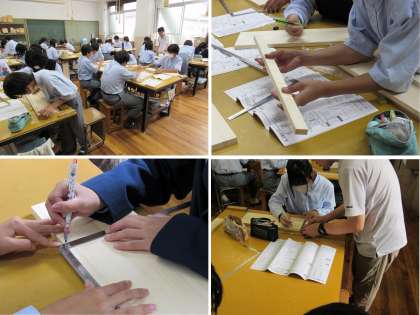 1年3組の技術科の授業では、前回配付を受けた木材加工の材料のけがき作業をしました。