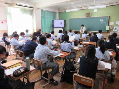 1年2組の英語科の授業では、単語テストに続いて、代名詞の変化表の復習をしました。